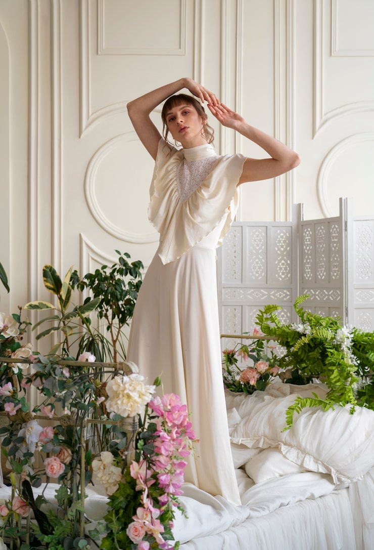 Свадебная коллекция создана в соответствии с классическими канонами: в ней преобладают белые оттенки, используются невесомые прозрачные материалы и деликатное кружево.